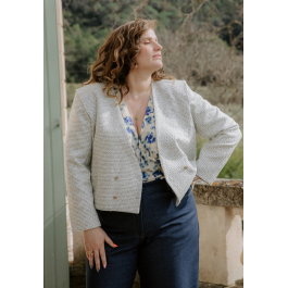 Avec sa coupe structurée et épurée, le spencer DAMAS est aussi élégant que versatile. Sans col, avec un double boutonnage bas, son volume est travaillé par des découpes, et sa ligne d’épaule joliment définie et travaillée par un savant jeu de pli sur la tête de manche. Sa ligne est courte, à peine cintrée et les épaules sont marquées sans être surtaillées. Faussement classique, cette petite veste se mariera aussi bien avec une robe fluide et bohème qu’avec un beau jean taille haute, ou encore associée à un pantalon à pinces comme Belém ou Brooklyn pour costume à l’allure très contemporaine.
