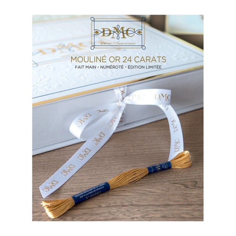 Ce coffret d’exception renferme une échevette numérotée de fil mouliné métallisé Or 24 carats, un véritable petit chef-d’œuvre artisanal. L’échevette est composée d’une âme en argent plongée dans un bain d’or pur 24 carats, mesurant environ 8 m et pesant 5 g — gage de matière noble et rare.